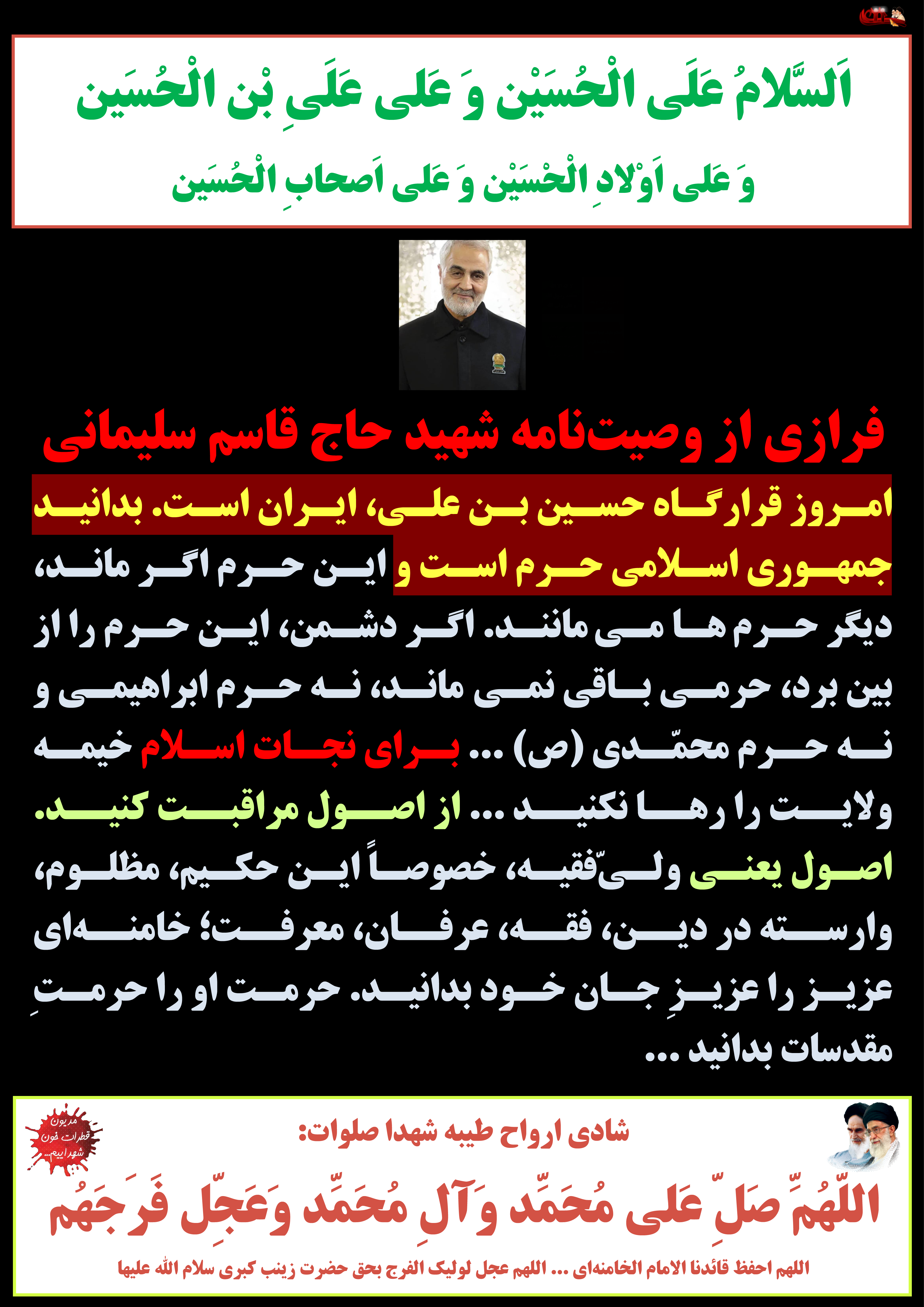 امروز قرارگاه حسین بن علی، ایران است. بدانید جمهوری اسلامی حرم است و این حرم اگر ماند، دیگر حرمها میمانند. اگر دشمن، این حرم را از بین برد، حرمی باقی نمیماند، نه حرم ابراهیمی و نه حرم محمّدی (ص) ... برای نجات اسلام خیمه ولایت را رها نکنید ... از اصول مراقبت کنید. اصول یعنی ولیّفقیه، خصوصاً این حکیم، مظلوم، وارسته در دین، فقه، عرفان، معرفت؛ خامنهای عزیز را عزیزِ جان خود بدانید. حرمت او را حرمتِ مقدسات بدانید ...