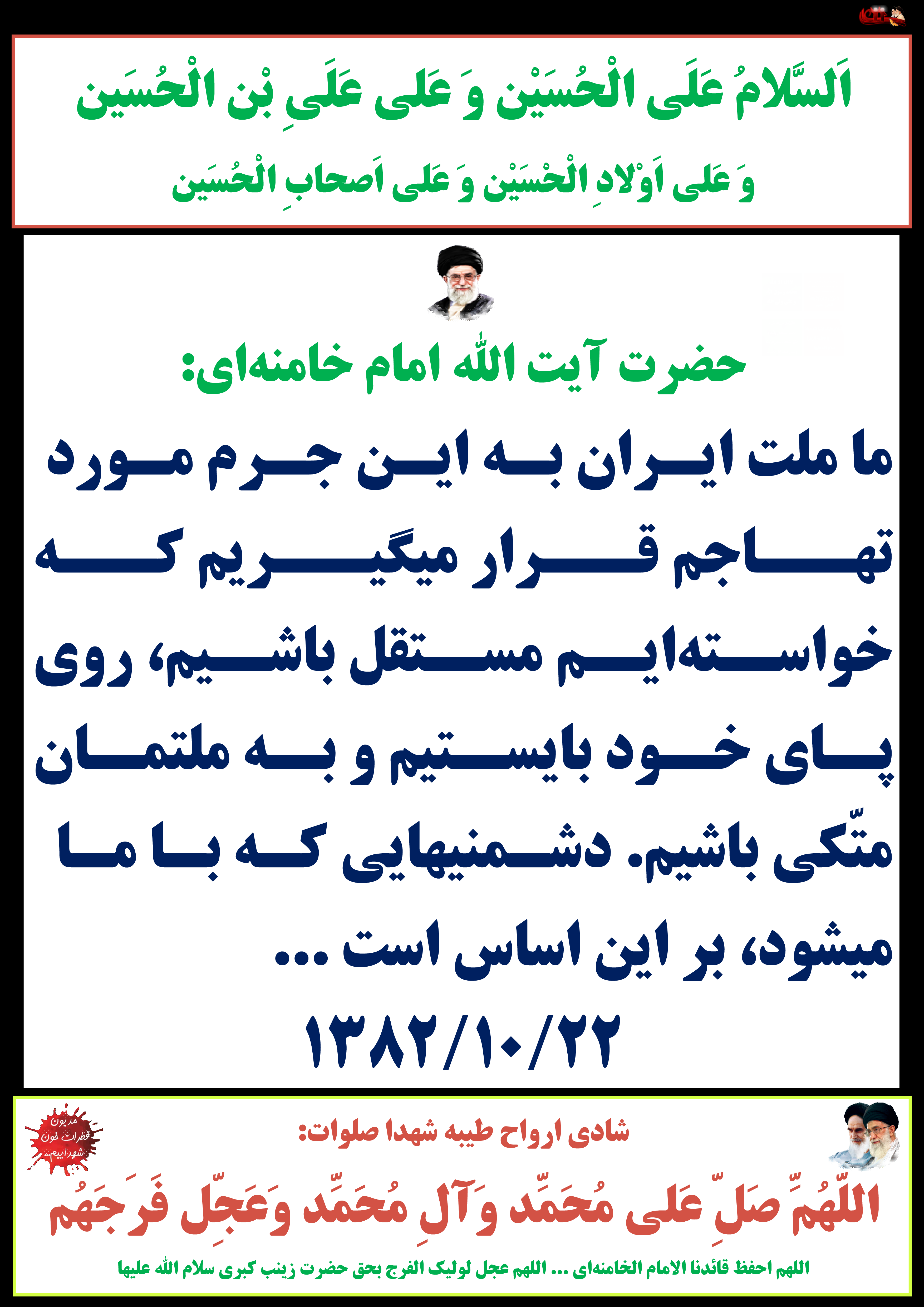 ما ملت ایران به این جرم مورد تهاجم قرار میگیریم که خواستهایم مستقل باشیم، روی پای خود بایستیم و به ملتمان متّکی باشیم. دشمنیهایی که با ما میشود، بر این اساس است ... 22/10/1382