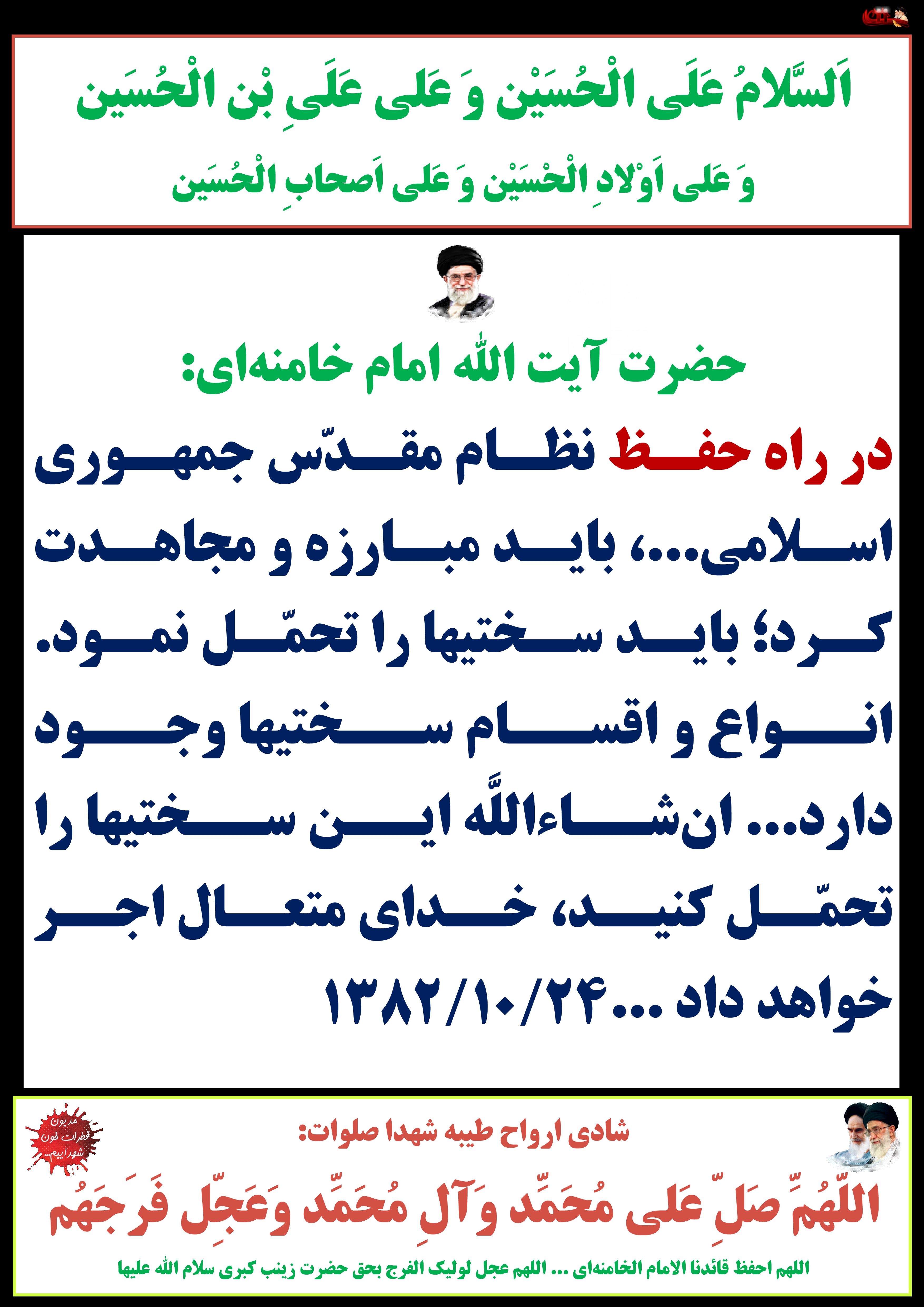 سلامتی و تعجیل در فرج امام زمان علیه السلام، هدیه به ساحت مقدس حضرت زهراء سلام الله علیها، ائمه اطهار علیهم السلام، امام خامنهای حفظه الله تعالی و ارواح طیبه شهداء صلوات